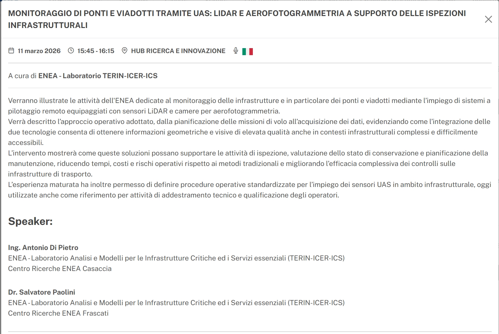 Monitoraggio di ponti e viadotti tramite UAS (Sistema Aeromobile a Pilotaggio Remoto) - DronitalyL’11 marzo ENEA sarà presente all’Hub Ricerca e Innovazione con l’intervento dei ricercatori Antonio Di Pietro e Salvatore Paolini, dal titolo “Monitoraggio di ponti e viadotti tramite UAS: LiDAR e aerofotogrammetria a supporto delle ispezioni infrastrutturali”. Durante la sessione saranno illustrate le attività sviluppate dall’Agenzia per il monitoraggio delle infrastrutture di trasporto, con particolare riferimento a ponti e viadotti, attraverso l’impiego di sistemi aeromobili a pilotaggio remoto equipaggiati con sensori LiDAR e camere per aerofotogrammetria. L’intervento descriverà l’approccio operativo adottato, dalla pianificazione delle missioni di volo all’acquisizione dei dati, evidenziando come l’integrazione delle due tecnologie consenta di ottenere informazioni geometriche e visive di elevata qualità anche in contesti infrastrutturali complessi o difficilmente accessibili. Le soluzioni sviluppate da ENEA possono supportare le attività di ispezione, valutazione dello stato di conservazione e pianificazione degli interventi di manutenzione, contribuendo a ridurre tempi, costi e rischi operativi rispetto ai metodi tradizionali e migliorando l’efficacia complessiva dei controlli sulle infrastrutture. L’esperienza maturata ha inoltre consentito di definire procedure operative standardizzate per l’impiego dei sensori UAS in ambito infrastrutturale, oggi utilizzate anche come riferimento per attività di addestramento tecnico e qualificazione degli operatori.